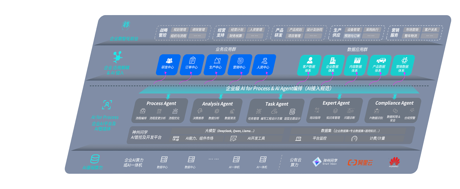 端到端的一站式AI工作空间深度融合了从企业战略规划到日常经营的全流程业务板块,,定向解决车企内部领域多、、、部门多、、、链条长、、、场景碎片化等难题,,,支持车企快速构建以AI为核心的生产力写作体系,,,实现任务执行与AI能力的无缝集成与交互