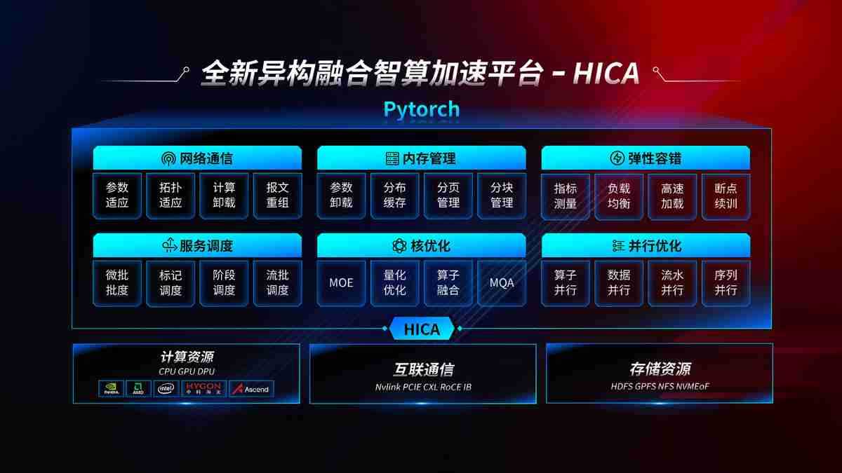 通过自研的服务层、、、、中间适配层、、、以及调度编排算法,,,,采用数据并行、、、模型并行等多种并行方式,,,,把并行计算任务进行有效的分解,,,,使其分别由相应的软件栈和算力资源来承接。。。。当GPU资源变化,,,HICA可以实时动态调度计算子任务并调整模型拓扑和架构,,以充分聚合各种算力资源。。。